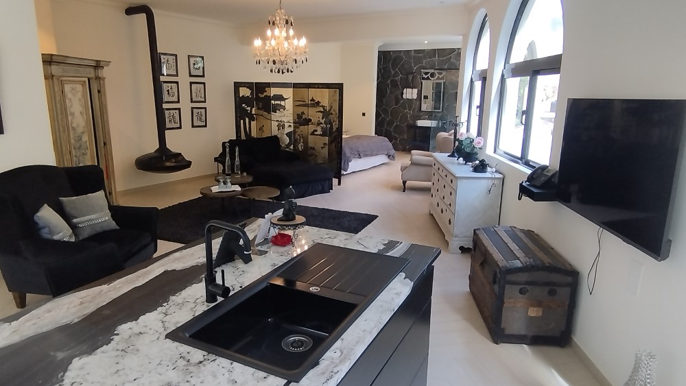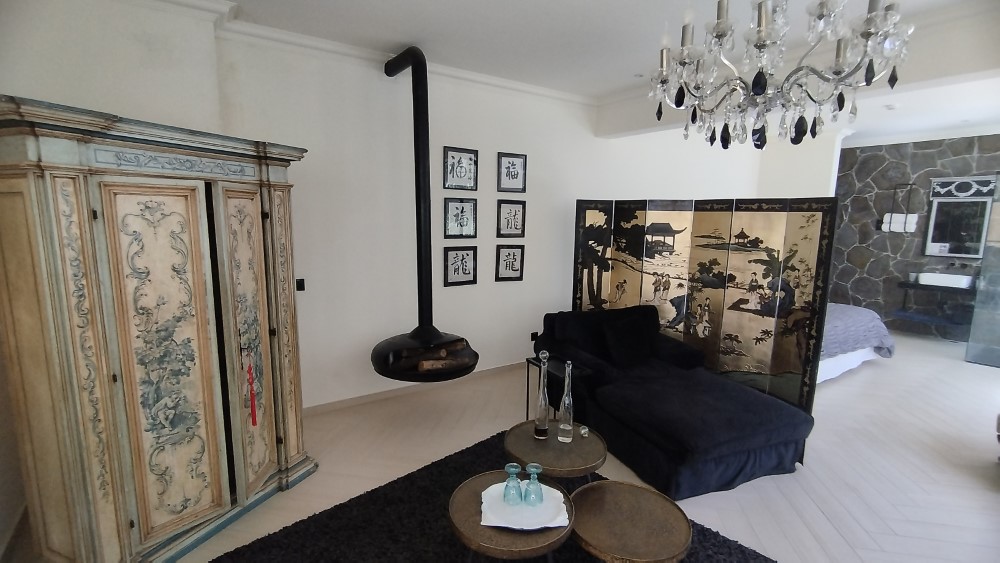 This is our most luxurious, spacious, and private suite, with a boosting 77 square meter space, a fully black marble kitchen isle that exhales elegance, a fluctuating fireplace and stone wall. For relaxing, there is a set of black love seats, facing the 55-inch smart tv, backed by the panoramic view of the valley. The king size bed also faces the view, allowing you to be graced by a magnificent image upon waking up. The open space bathroom, with a bathtub and a fully glass shower is also a good option to relax and breathe the pure air of Paul. The room is equipped with chandeliers, antique furniture – wardrobe, nightstands and chest of drawer and rugs, amplifying the sense of royalty transmitted by the room. You will find air conditioning, mini bar, a safe, hair dryer, mirror, shower gel, robes, free and fast Wi-Fi, smart TV, telephone, and a drink corner.